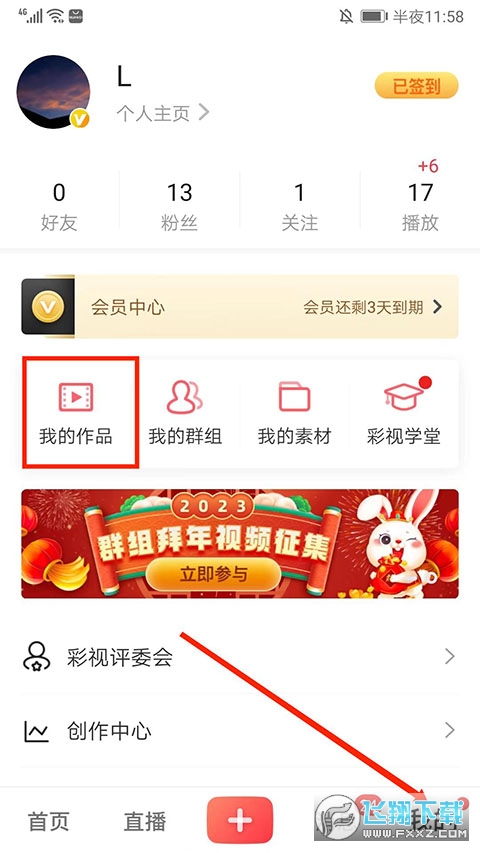 1、打开彩视app,选择右下方“我的”选项,进入到个人中心界面,选择“我的作品”图标,