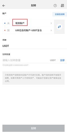 2、默认是从【现货账户】转账到【U本位合约账户-USDT全仓】。