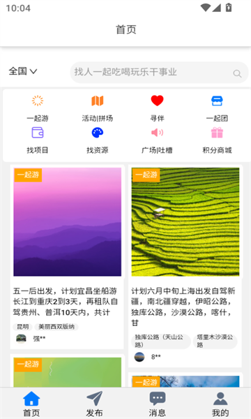1、一起寻伴,在线组队吃喝玩乐搞事情。可寻驴友|寻伴侣|寻合作伙伴|寻资源等。包括组队出游|拼场拼团|相亲交友|项目合作|资源分享等