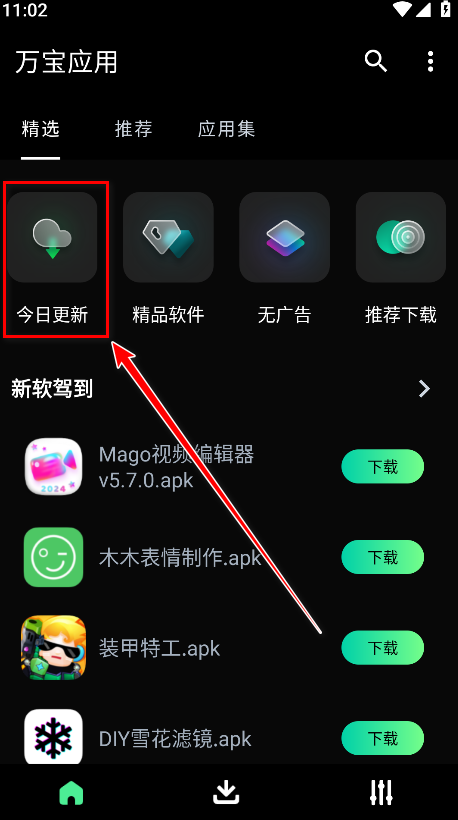 1.打开万宝应用,可以看到主页中间有着四大板块内容,如今日更新、精品软件、无广告、推荐下载。每一个板块下面都有着最新的内容,大家可以自由的下载使用哈。