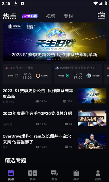 5EPlay是专注于电竞赛事的对战平台。其中也是聚合了多样化的功能,比可以观看各大战队的比赛赛事,还有最新的一些资讯都能知晓。玩家社区自由交流,一起嗨皮一起玩。