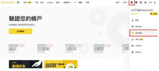 1.登录币安帐户,然后点击【用户中心】-【身份认证】。