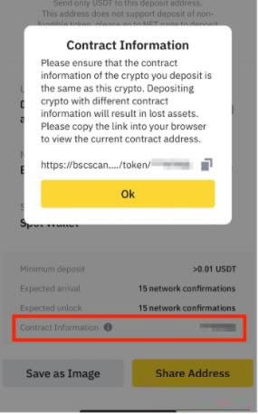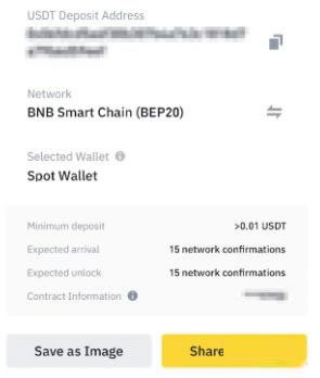 7. 在确认好网络、合约资讯与钱包后,点选【复制图示】,以复制并将个人的币安钱包充值地址贴到自己想要提现加密货币的平台地址栏中。也可以点选【储存成图片】并直接汇入提现平台上的二维码。