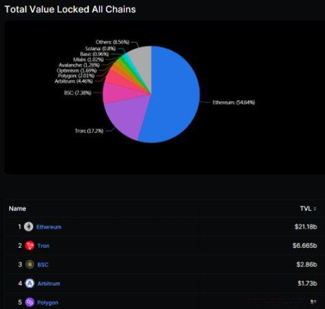 以TVL 来排名,以太坊则是绝对王者,光它一条链就超过整个加密货币市场一半以上的TVL。