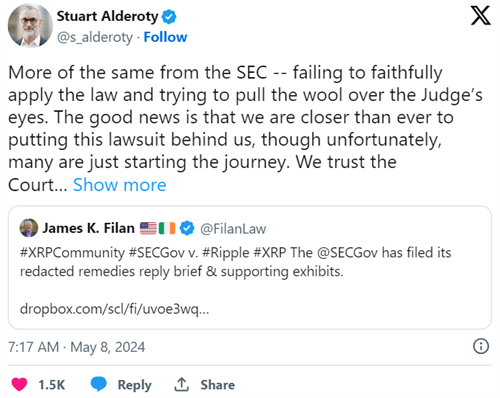 在美国证券交易委员会提交补救措施简报后不久,Ripple 的首席法律官 Stuary Alderoty 表示,美国证券交易委员会一直未能忠实地适用法律。有趣的是,他补充说,他们更接近于结束 XRP 诉讼。尽管更广泛的加密社区一直在热切等待Ripple 与 SEC案件的最终判决,但分析师认为,这一结果要到 9 月份才会到来。