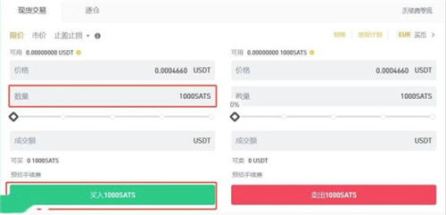 8、在交易界面,填写您希望买入的SATS数量,随后点击【买入1000SATS】按钮,即可轻松完成SATS币的交易操作。